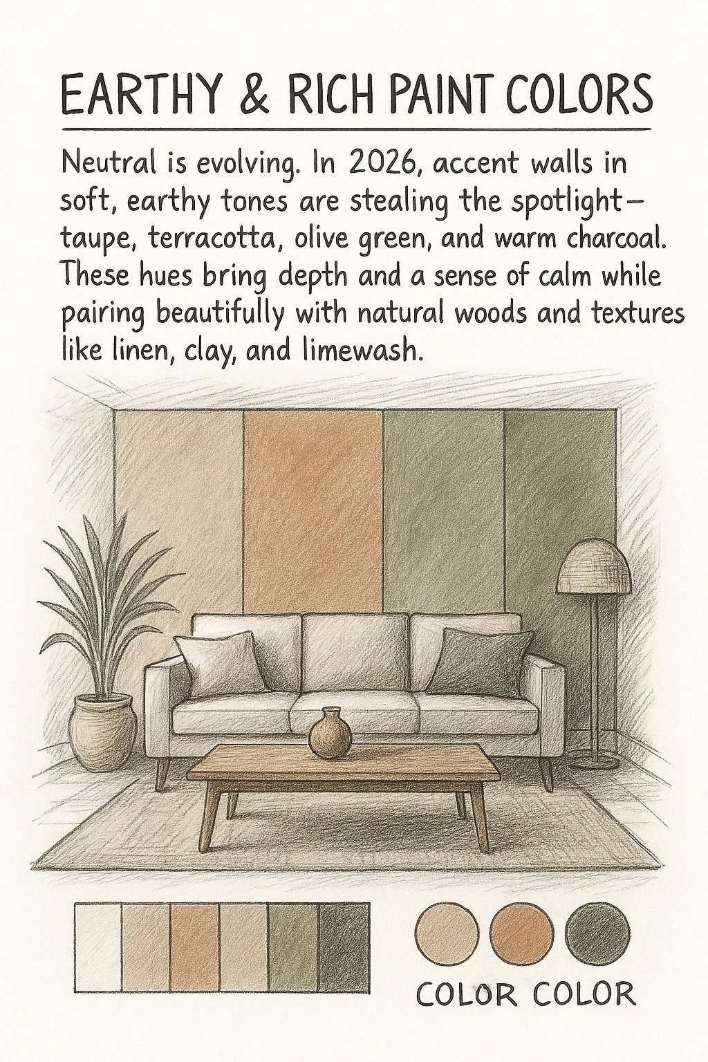 Earth-inspired tones—taupe, terracotta, olive green, and charcoal—define this accent wall concept. These calming hues work beautifully with organic textures like linen, limewash, and natural woods, making it a leading trend for 2026 interiors.