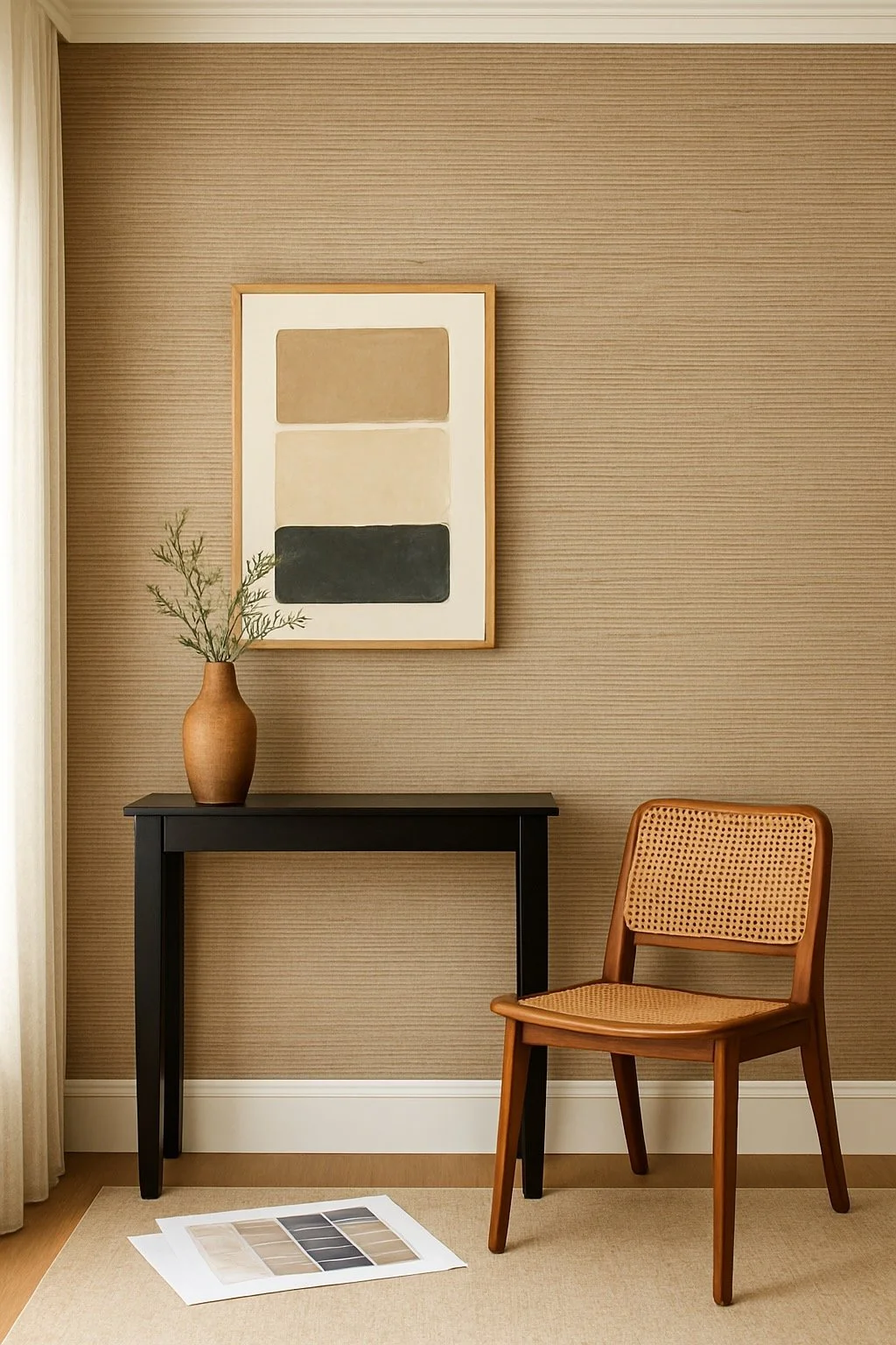 Minimalist and refined, this textured wallpaper wall delivers a timeless look with warm neutral tones. Paired with elegant furniture and natural light, it brings depth and sophistication to any living space.