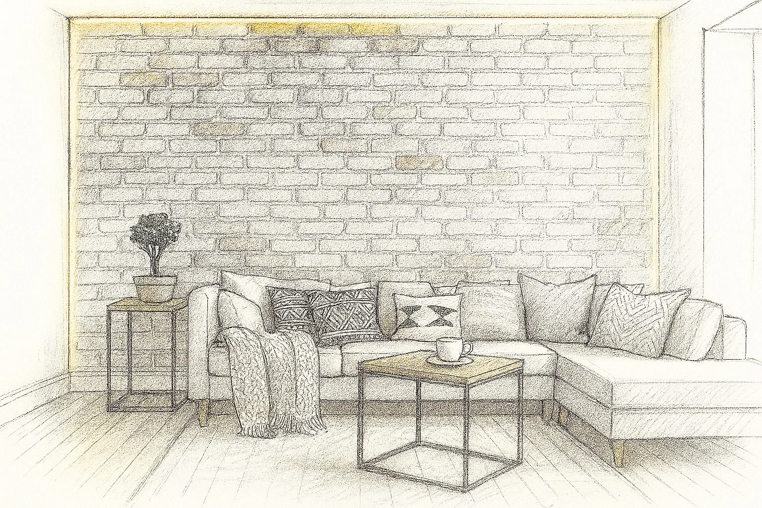 Inspired by nature and texture, this accent wall features a subtle brick pattern softened by a warm limewash finish. The design offers a cozy, lived-in feel while staying light and modern.