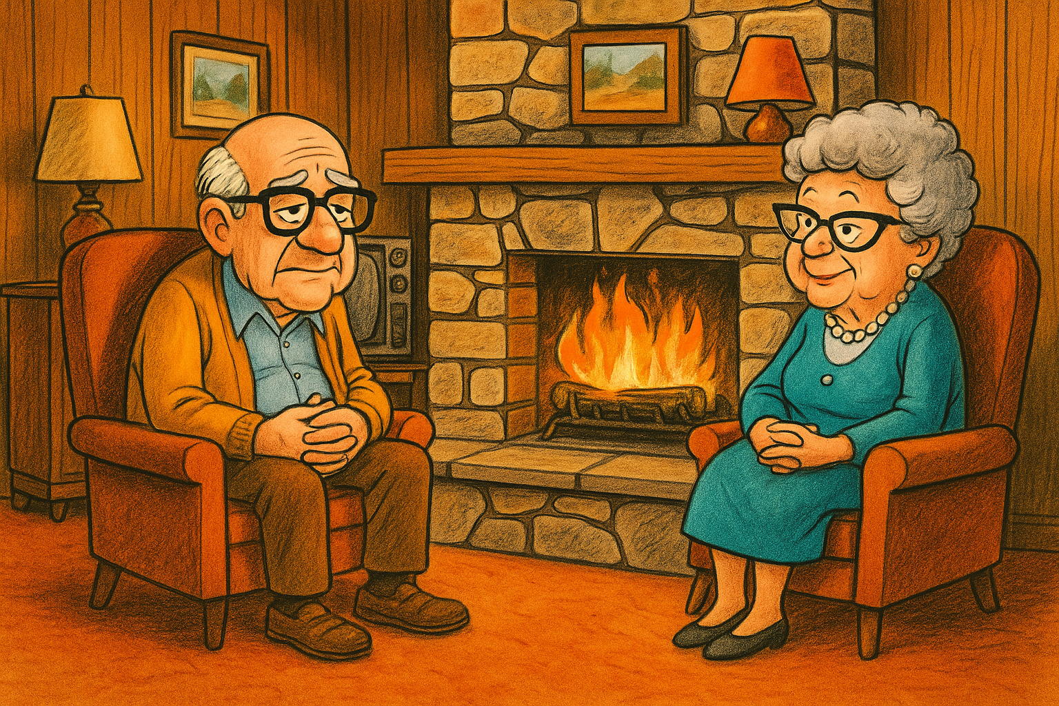 A humorous tribute to the past, this caricature illustration captures a classic 1980s interior with stone fireplace, dark wood paneling, and two elderly characters enjoying the old-school charm.