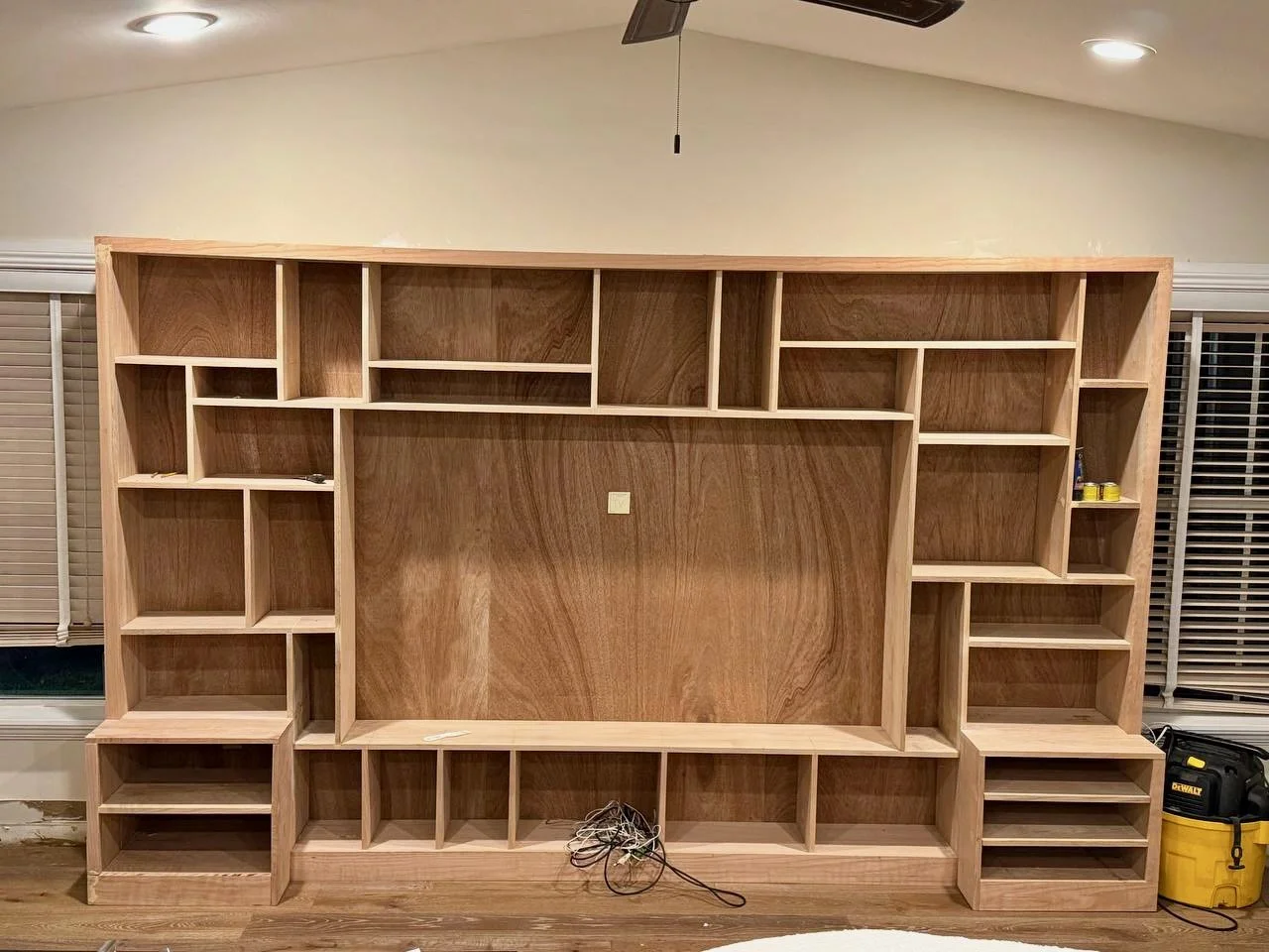The entire structure was fabricated from red oak plywood and solid components, assembled on site, and finished with a custom stain selected by the client. The natural wood grain remains visible, giving the wall warmth and depth while preserving a clean, structured geometry.
