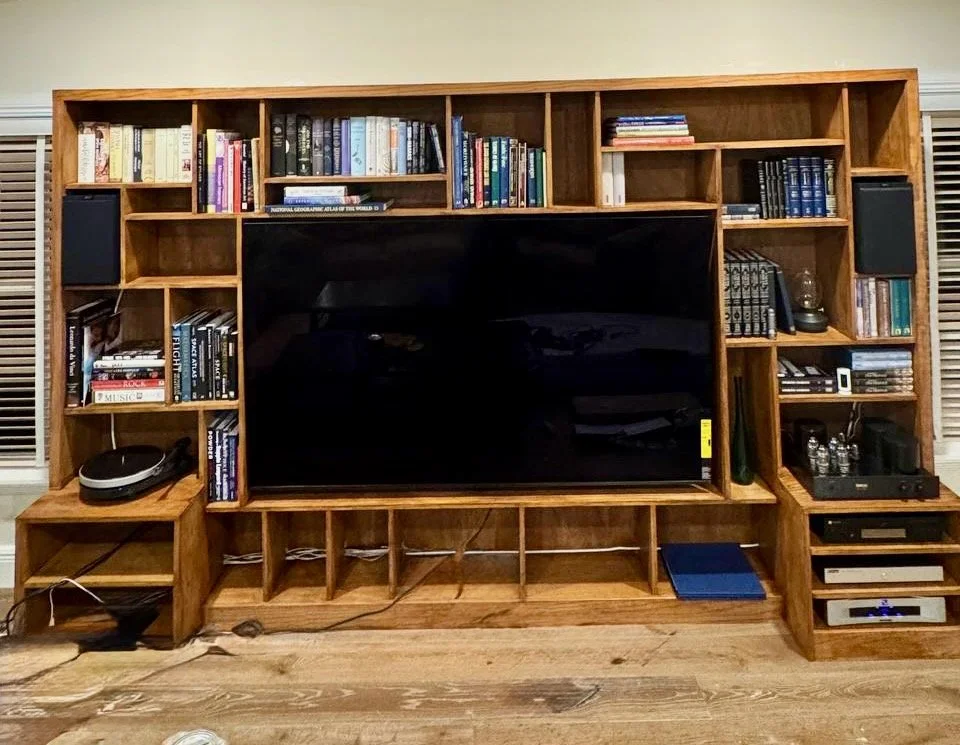 This project was completed in Miami, Florida and features a fully custom media wall built from solid red oak. The client provided initial sketches and layout ideas, and our team translated them into a precise, functional, and durable built-in solution. The result is a large-scale entertainment center designed to accommodate a TV, books, audio equipment, and decorative storage while maintaining a cohesive architectural look.