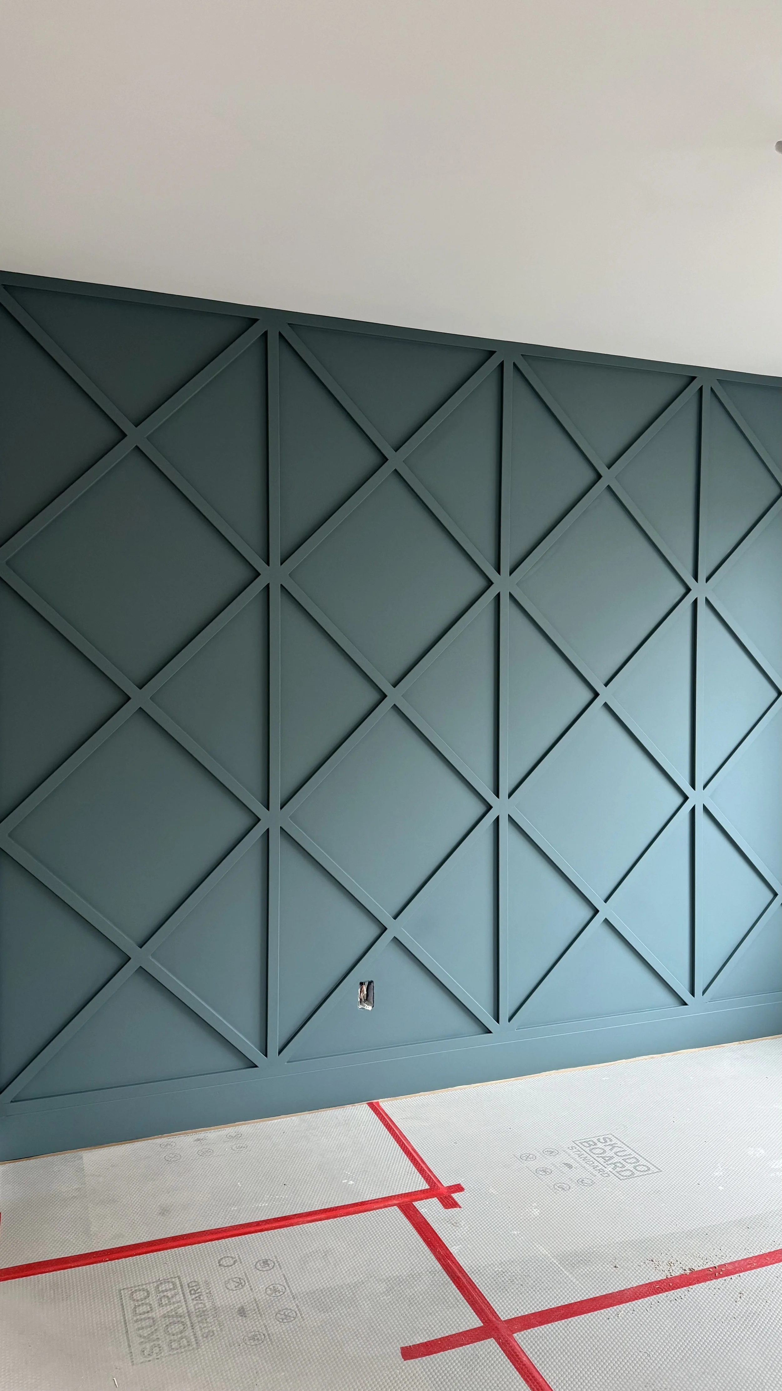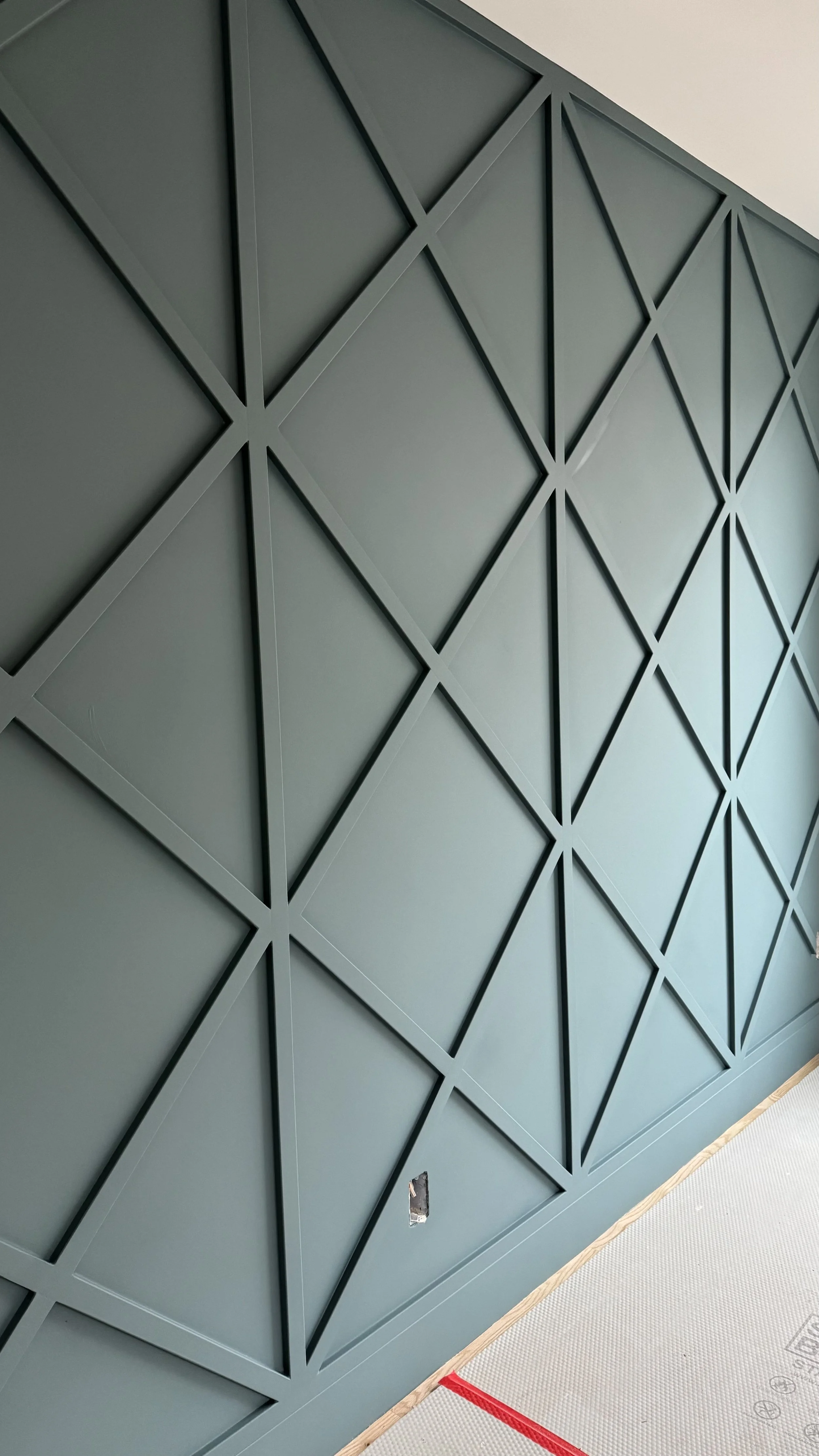 The wall itself was prepared by installing smooth base panels to ensure a uniform surface. Precision-cut trim pieces were then applied in a crisp diagonal diamond pattern across the entire wall. All surfaces, including the trim and panels, were then meticulously sprayed using professional-grade equipment to achieve a flawless, satin-smooth finish.