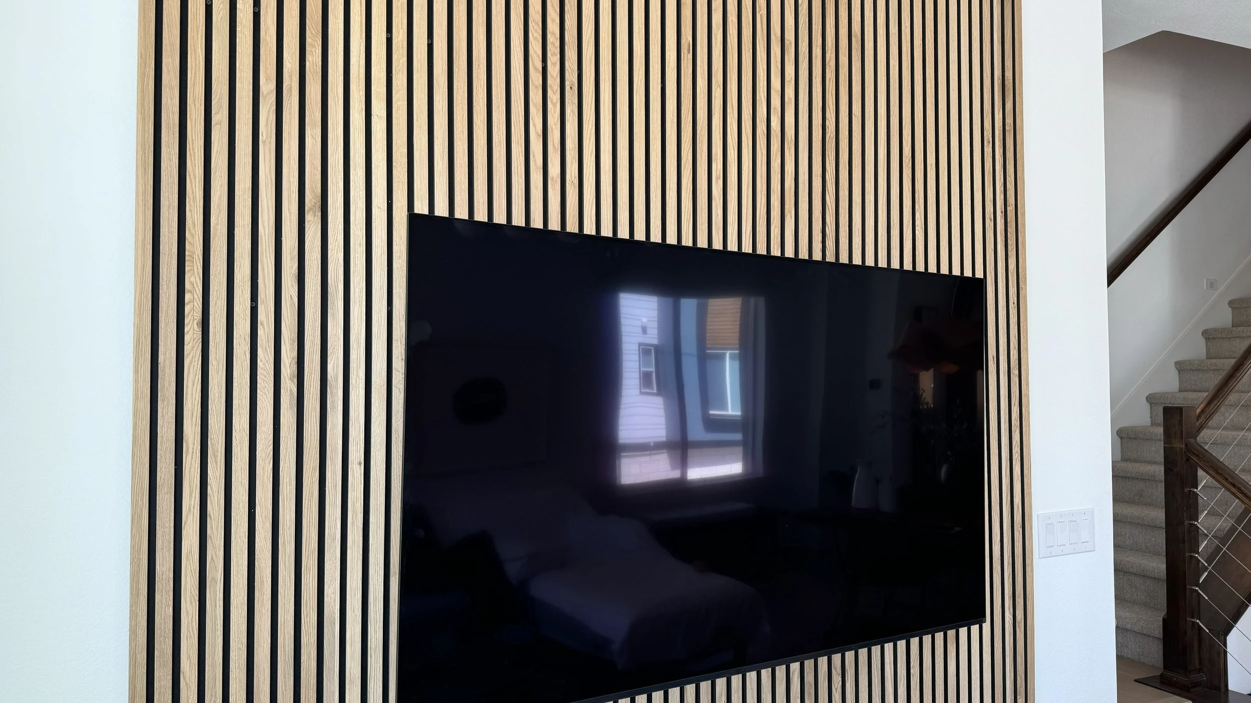 Este proyecto en Arvada, Colorado, presenta una pared de medios moderna con paneles acústicos de listones de madera detrás del televisor. Aunque es una solución sencilla y rentable, su ejecución requiere precisión. Nuestro equipo completó la instalación profesionalmente y el cliente quedó totalmente satisfecho con el resultado elegante y limpio.