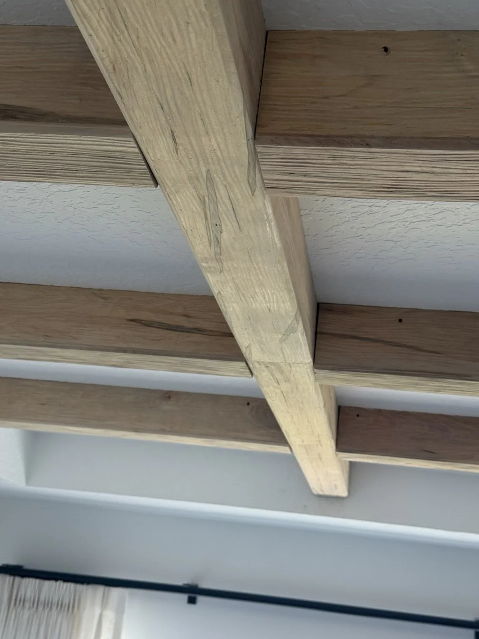 This project in Tampa, Florida, features a meticulously crafted grid of natural wooden ceiling beams. Installed in a tray ceiling design, these beams add architectural depth, warmth, and a sense of symmetry to the space. The light-toned finish enhances the natural texture of the real wood, highlighting its grain without altering its authentic look. This is not faux material — every element was fabricated and finished using genuine wood.