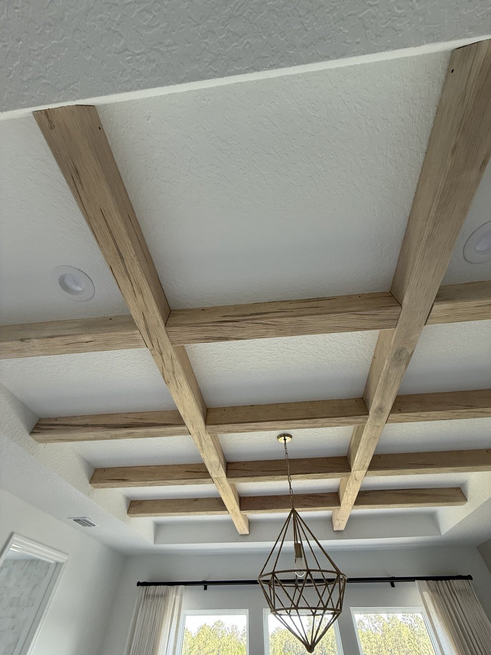 Grid of light natural wood ceiling beams in a tray ceiling with a modern chandelier in a Tampa home