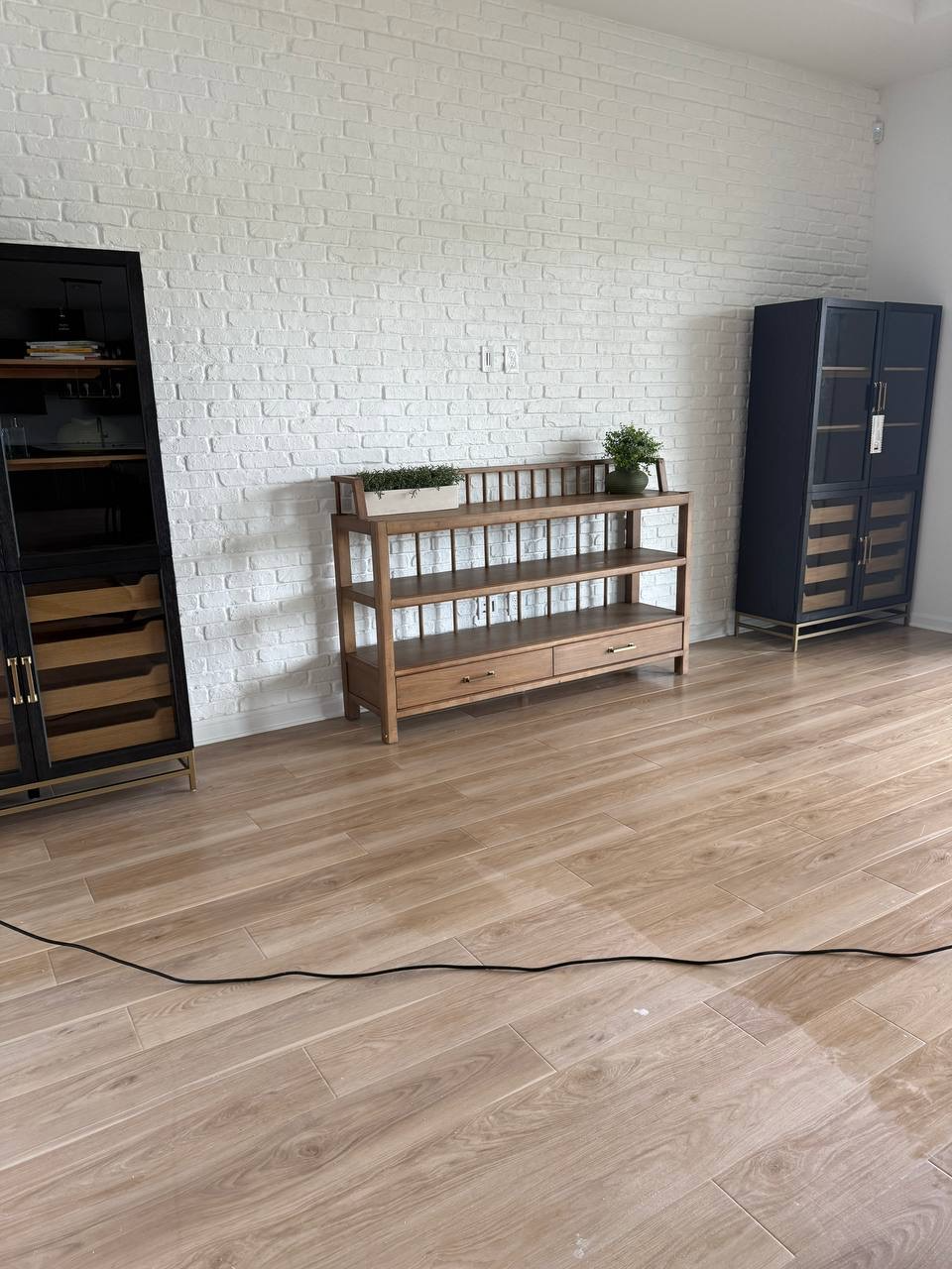 This installation not only brings warmth and texture to the space but also introduces a boutique, high-end aesthetic to the room. The final result is a seamless brick-look wall that pairs perfectly with the wood floor and furniture, adding character while maintaining a bright, airy atmosphere.