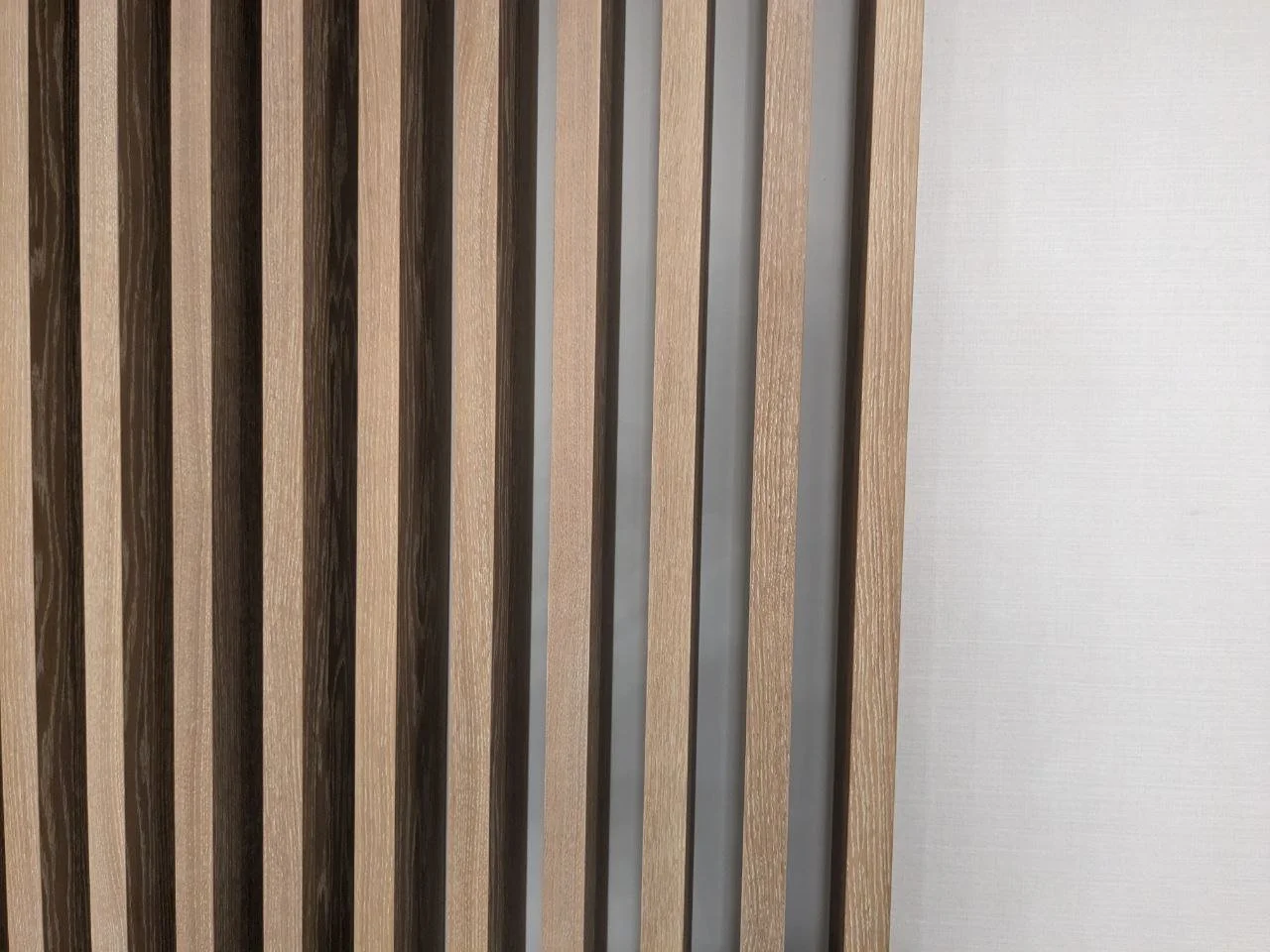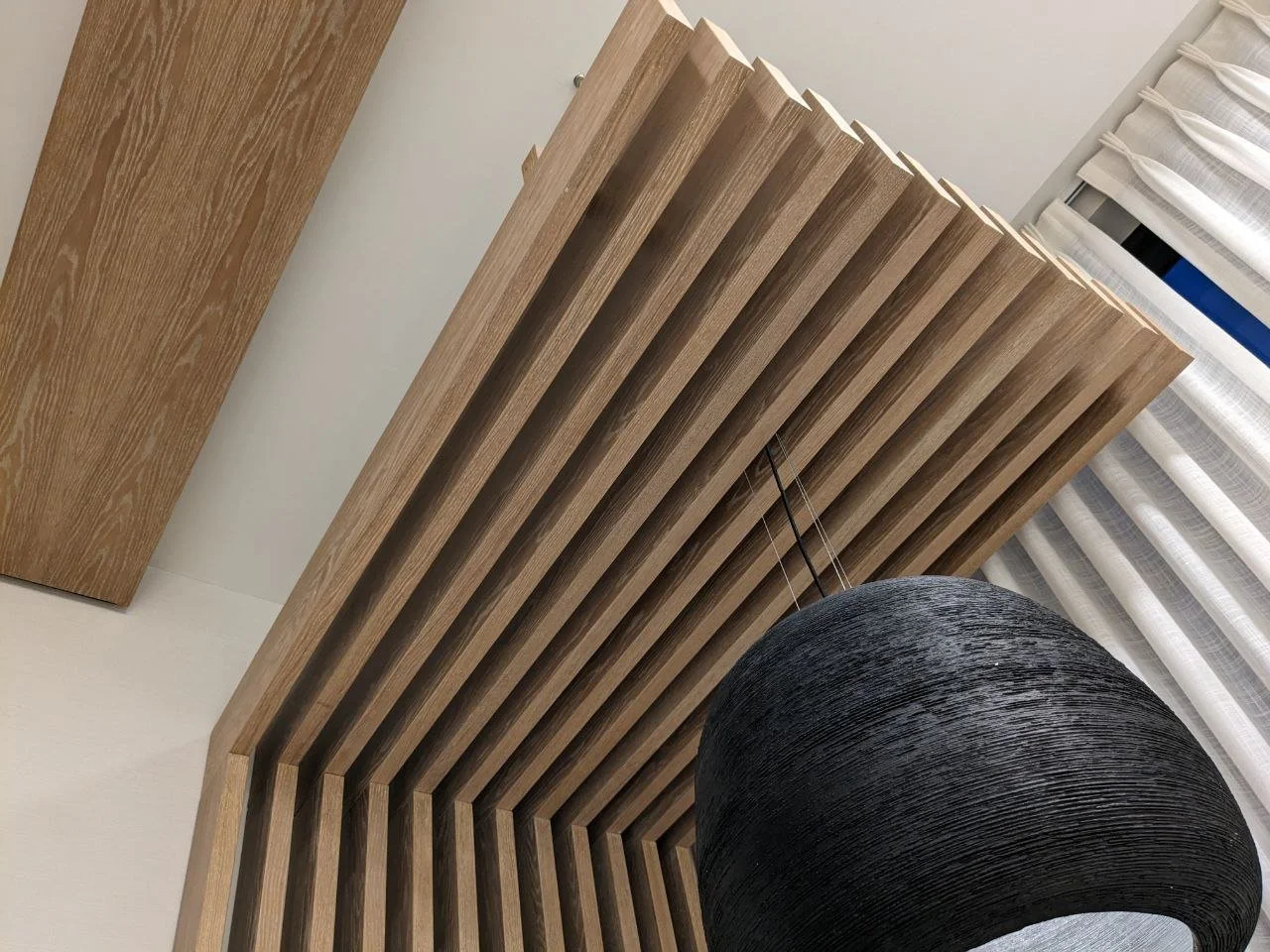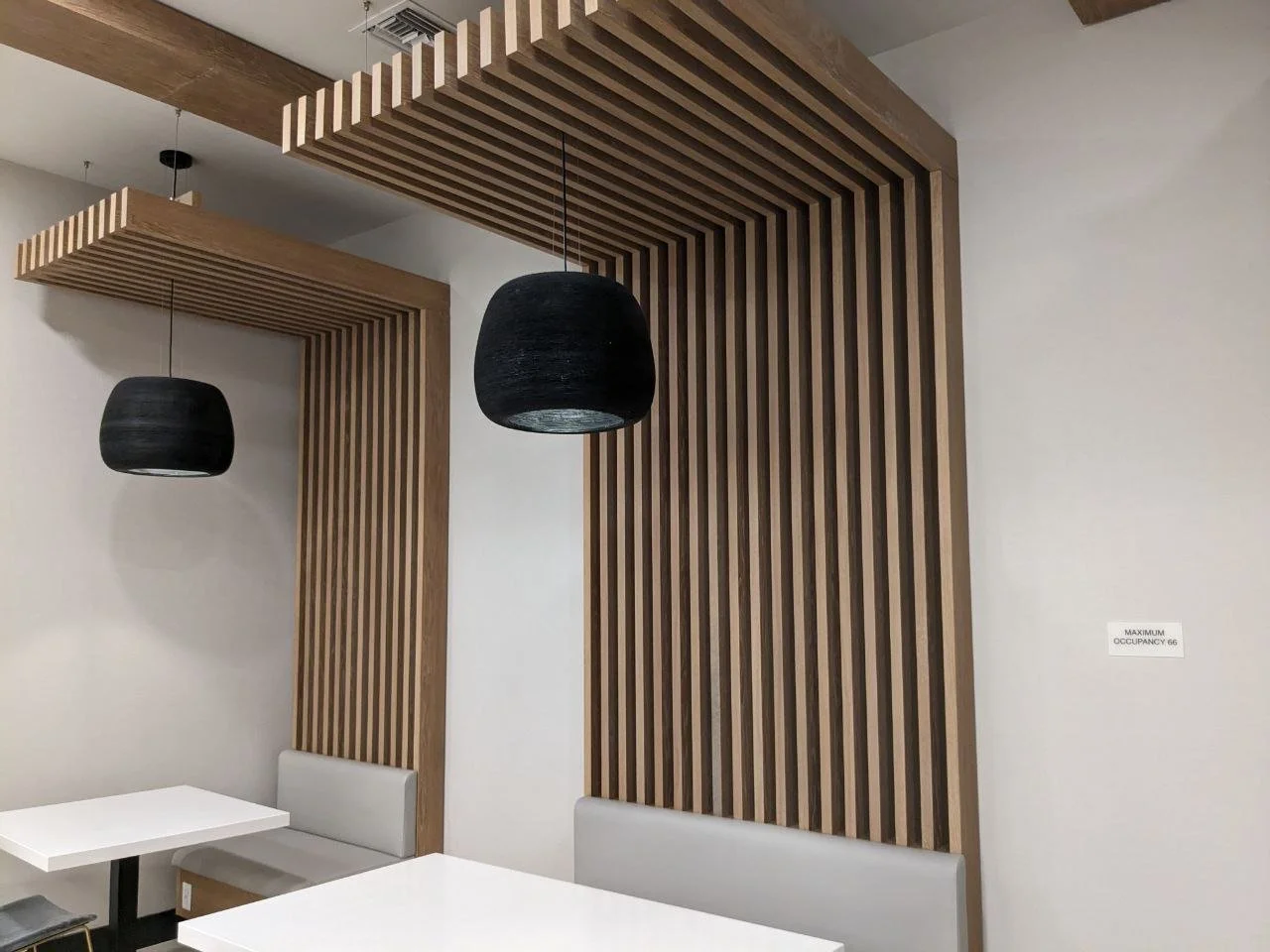 • Natural wood slat dividers for architectural zoning